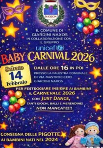 Il Comune di Giardini Naxos in collaborazione con il Gruppo Unicef organizzano il Baby Carnival 2026 sabato 14 febbraio presso la palestra comunale dalle ore 16 in poi. Tanti giochi, balli e merendine. Nel corso della manifestazione verranno assegnate le Pigotte ai bambini nati nel 2024.